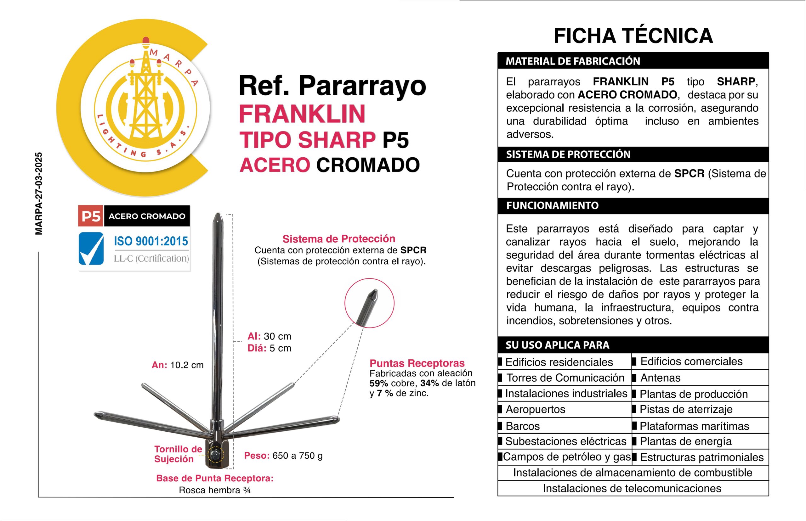 Pararrayo FRANKLIN TIPO SHARP P5 es hecho con bronce cromado, su función es atraer los rayos que se encuentran en el aire producidos por las tormentas, logrando que estos no se descarguen en personas o construcciones evitando así daño alguno..