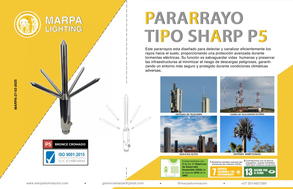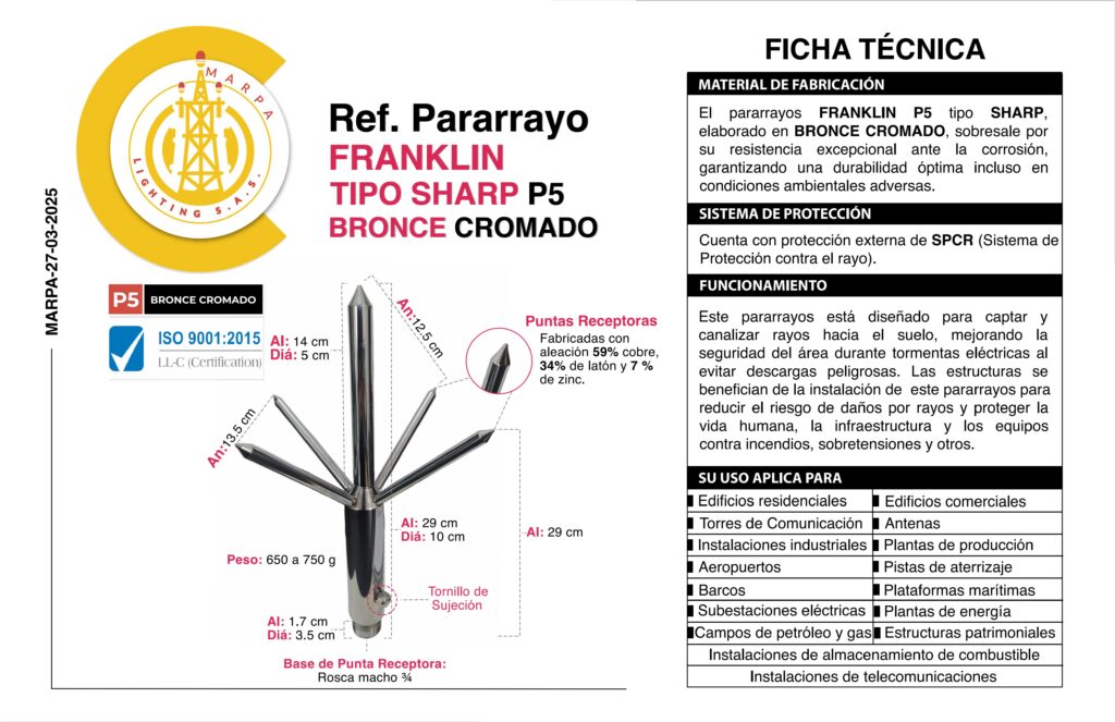 Pararrayo FRANKLIN TIPO SHARP P5 es hecho con bronce cromado, su función es atraer los rayos que se encuentran en el aire producidos por las tormentas, logrando que estos no se descarguen en personas o construcciones evitando así daño alguno.