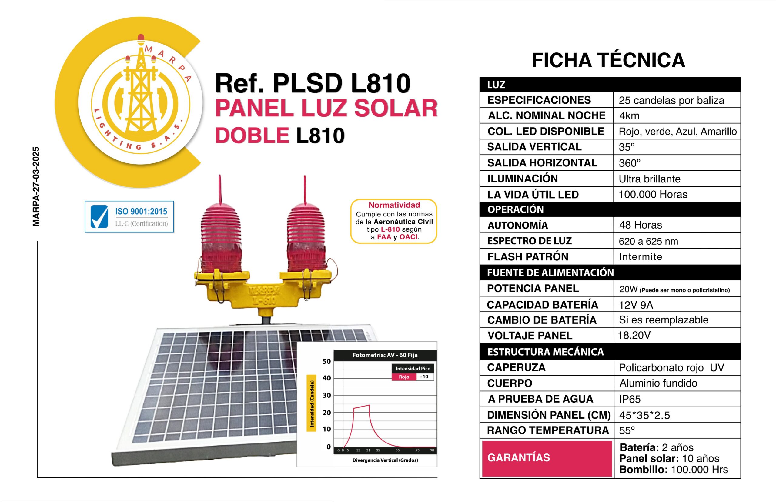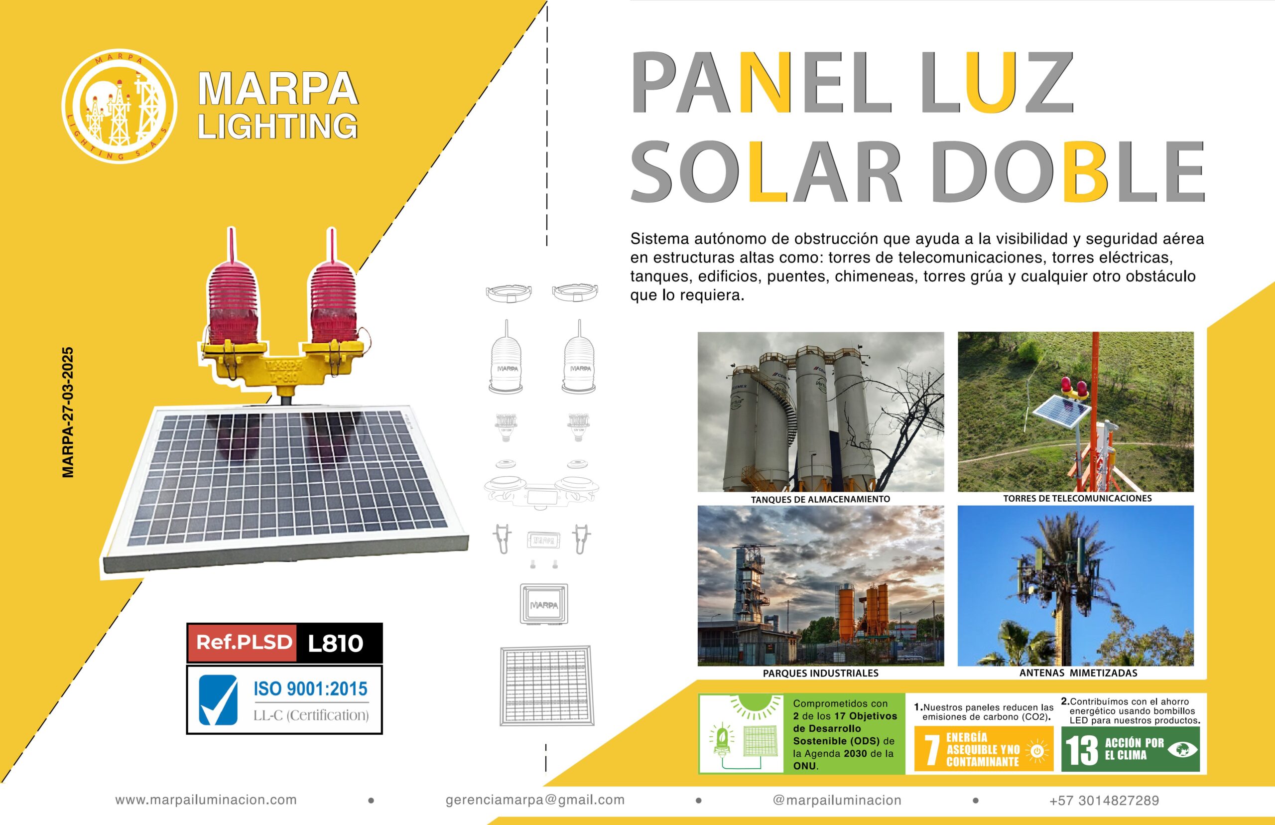 El Panel Luz Solar Doble es una baliza luminosa para aviación que marca obstáculos aéreos como torres y edificios altos. Funciona con energía solar, almacenando en una batería interna para alimentar luces LED intermitentes (rojas o blancas) durante la noche o en baja visibilidad. Estas balizas mejoran la seguridad aérea y, al no depender de la red eléctrica, son una opción sostenible y económica.