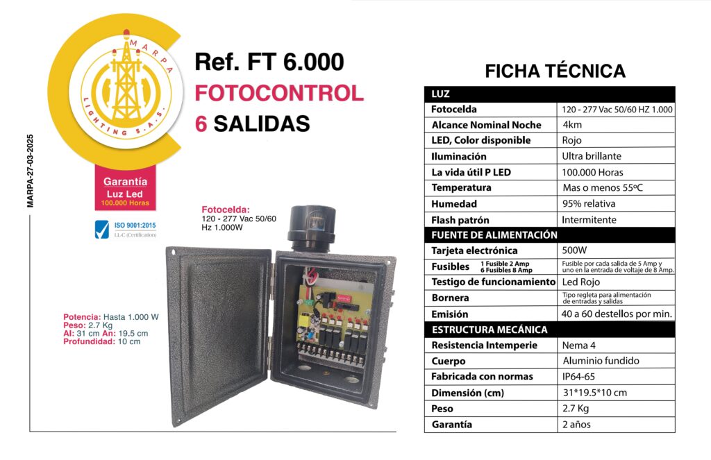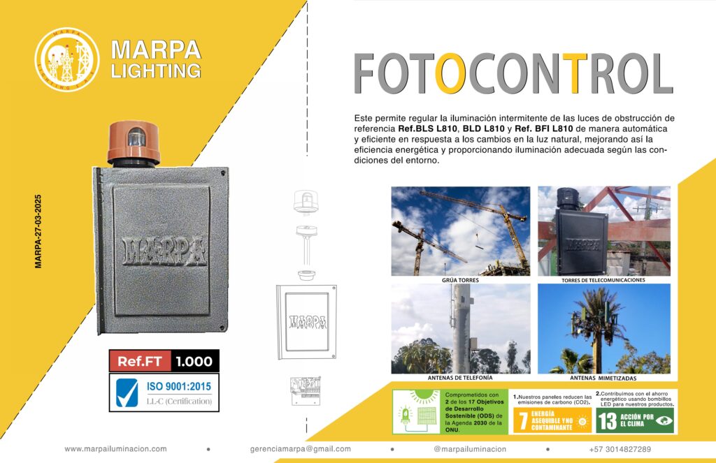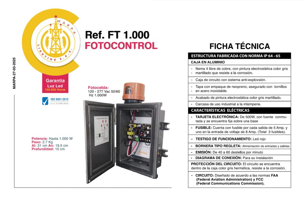 El fotocontrol FT 1.000 también conocido como célula fotoeléctrica o sensor de luz, es un dispositivo que se utiliza para controlar automáticamente la iluminación de las balizas de obstrucción de manera automática en función de la cantidad de luz ambiente. Funciona detectando cambios en la intensidad lumínica y activando o desactivando las luces conectadas a él según sea necesario.
